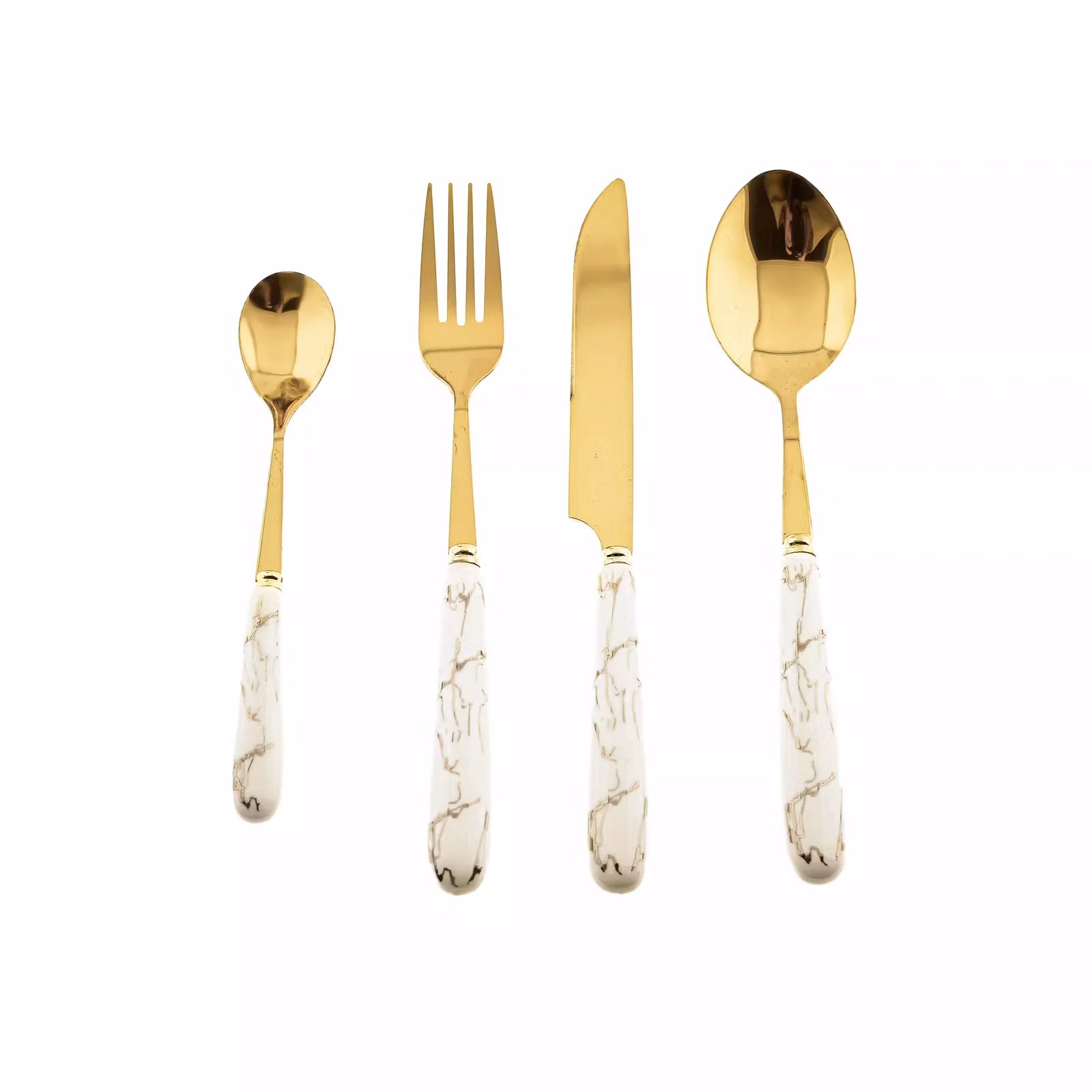 24-delers Bestikksett med Stativ i gull farge 649,- På lager. Legg i handlekurv Del Artikkelnummer: 625 Leverandør: Trendmax Produktbeskriving Tilbakemeldinger Produktinformasjon6-Personers bestikksett laget av rustfritt stål Materiale:Rustfritt stål, KeramikkInnhold:6 x Kniver6 x Skjeer6 x Gafler6 x Teskjeer
